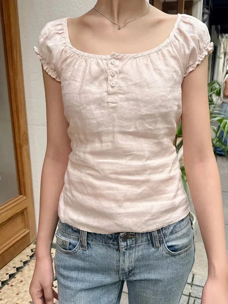 LIZAKOSHT - Women Sweet Pink Linen Lace-up Slim T Shirt Summer Buttons O-neck Puff Sleeve Blouse Vintage Preppy Solid Cute Tees Y2k