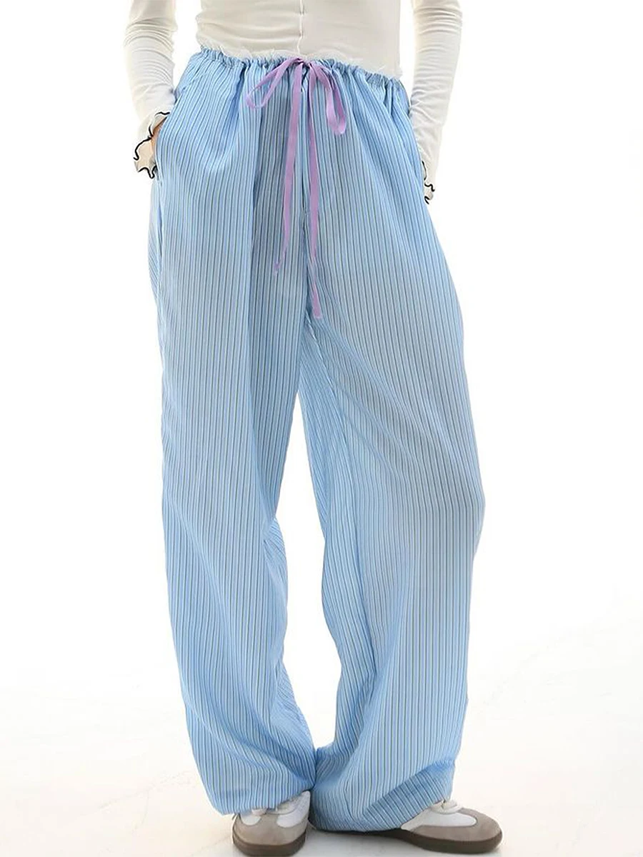 LIZAKOSHT  -  Women Wide Leg Pants Casual Loose Vertical Stripe Print Elastic Lounge Trousers with Pockets for Work Office Streetwear