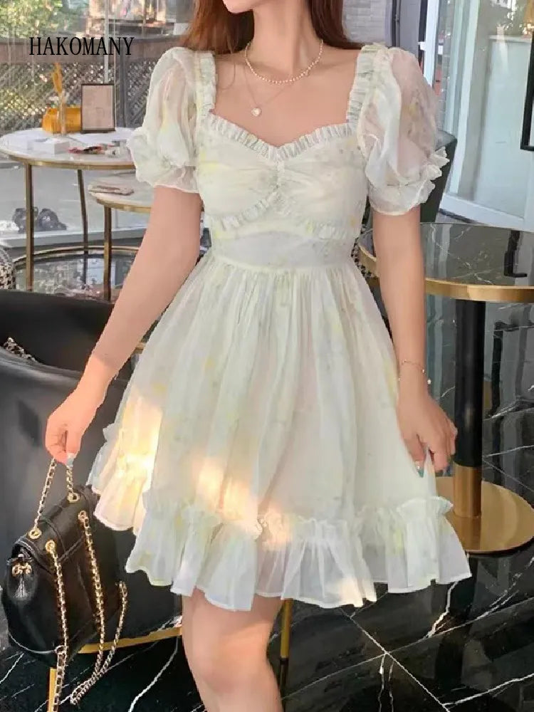 LIZAKOSHT - Women Wood ears Puff Sleeve Ruffles Hem Swing Short Fairy Cake Robe Princess Girl Flower Print Ruched Ball Gown Dress Retro