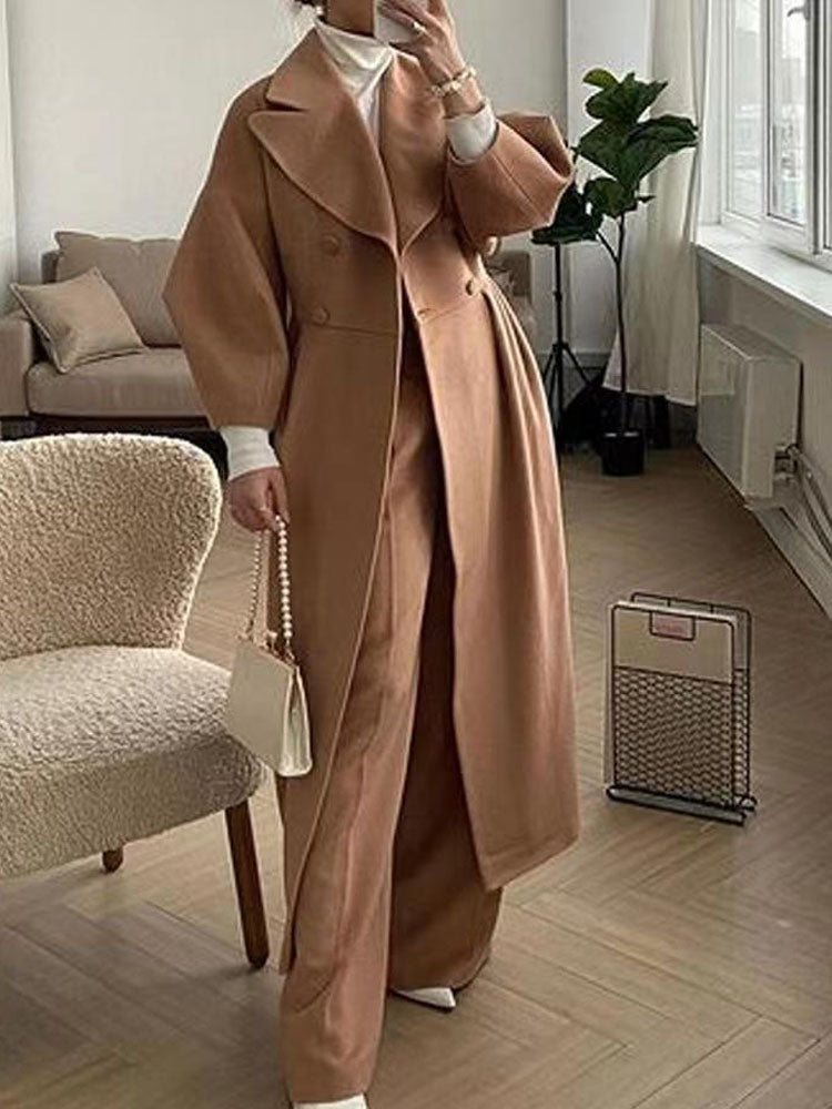 Lizakosht Women Woolen Coat Winter Lantern Sleeve Long Jackets Lapel Double-Breast Coat Office Lady Outerwear Windbreaker Thick Streetwear