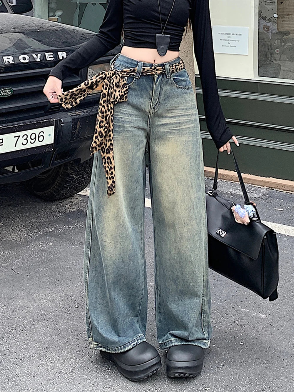 LIZAKOSHT - Women y2k Vintage Baggy Wide Leg Jeans 90s Streetwear Fashionable Denim Distressed Pants for 2000‘s Grunge Retro Clothes