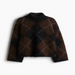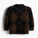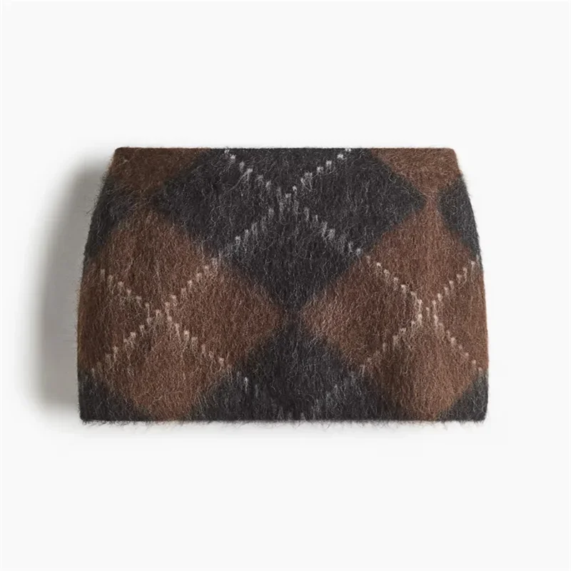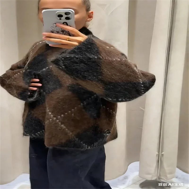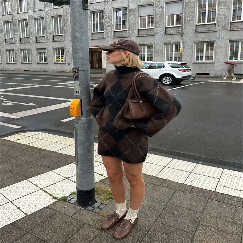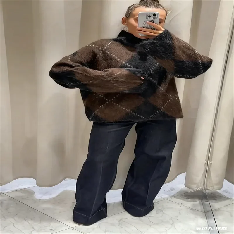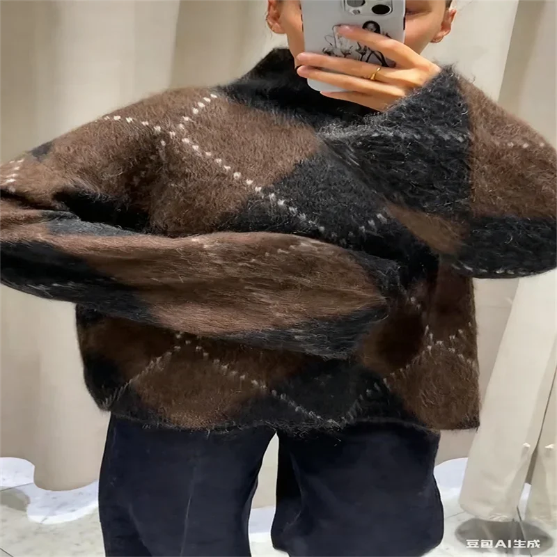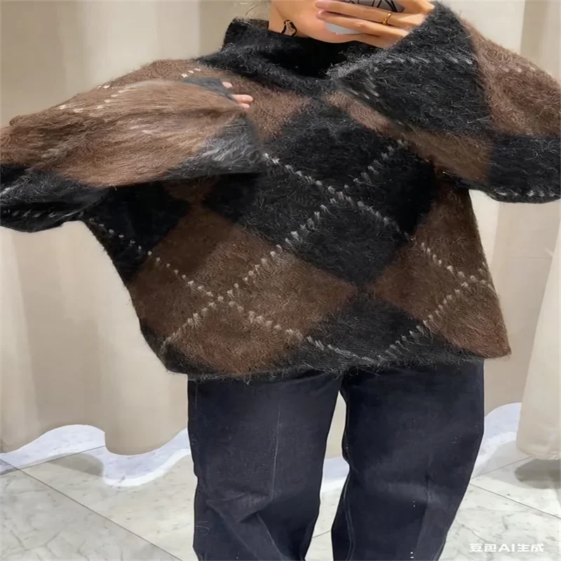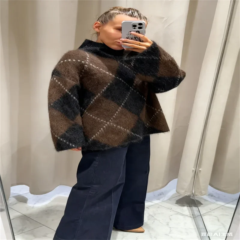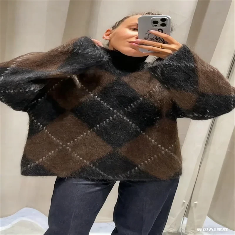 LIZAKOSHT - Women's Brown Argyle Pattern Turtleneck Sweater Fluffy Knit Long Sleeve Casual Pullover 2025 Autumn Winter Female Warm Knitwear