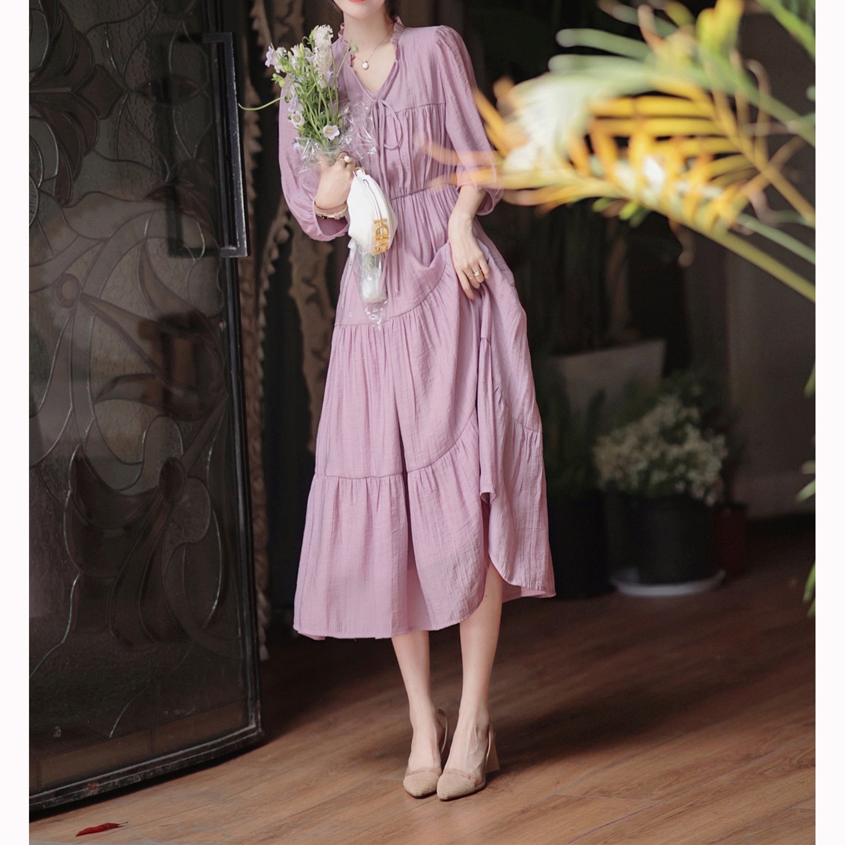 Lizakosht Women's New Spring New Style Wooden Ear Tie Fashion Lantern Sleeve Dress
