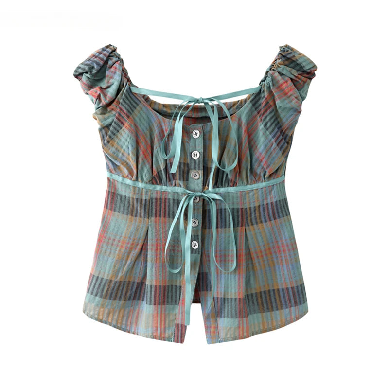 LIZAKOSHT - Women's Retro Contrast Color Pliad Short-sleeved Pure Cotton Shirts Female Summer Lace-up Slimming Single-breasted Blouse Tops