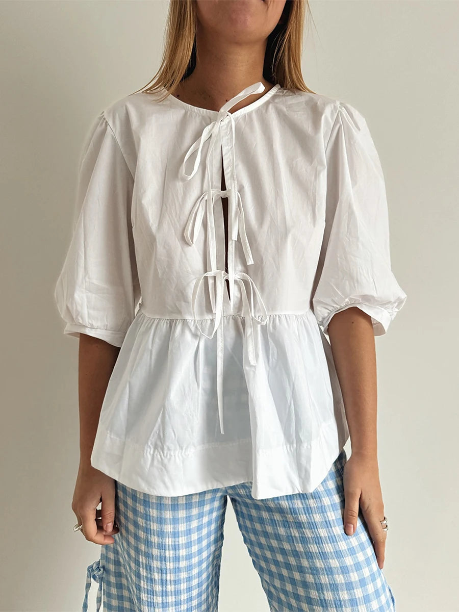 LIZAKOSHT - Women's Spring Summer Casual Peplum Tops Half Sleeve Open Front Tie Up Solid Color/Plaid Blouse Female Basic Shirts Streetwear