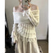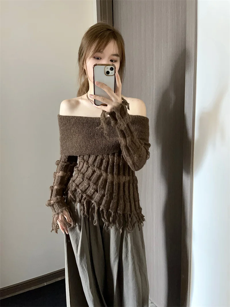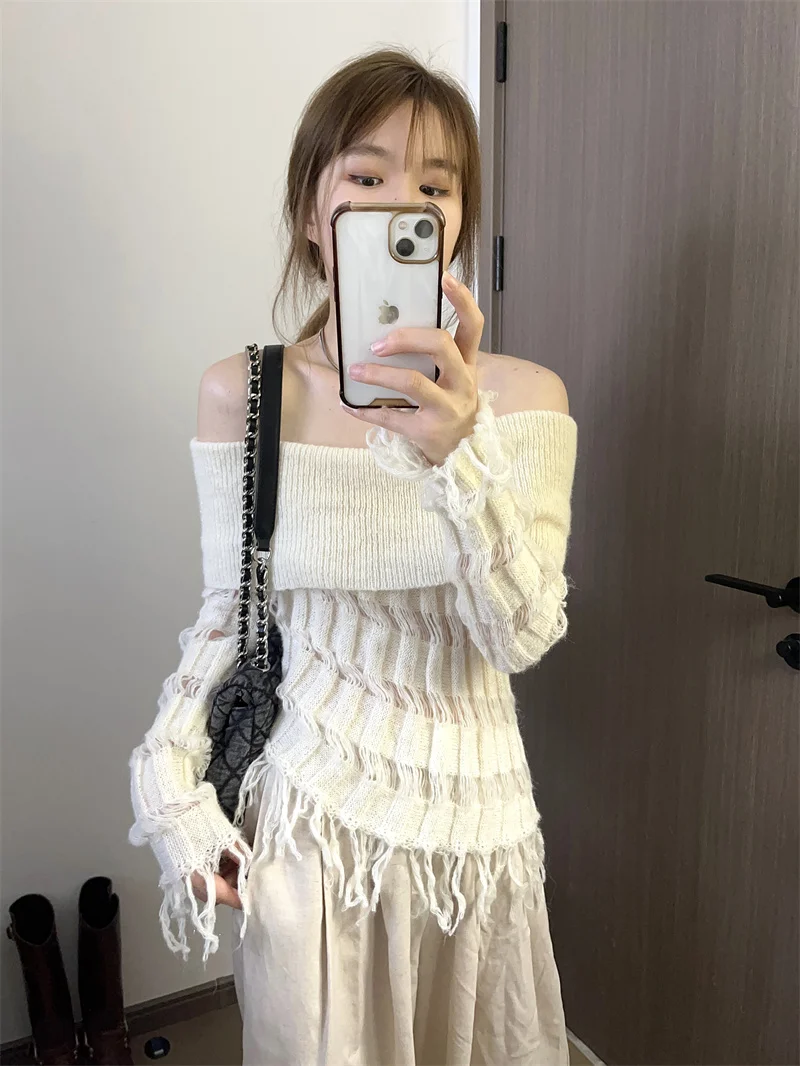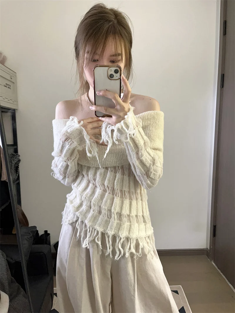 LIZAKOSHT - Women's White Pullover Knitted Sweater Harajuku Aesthetic Y2k Long Sleeves Slash Neck Sweaters Vintage 2000s Clothes Autumn