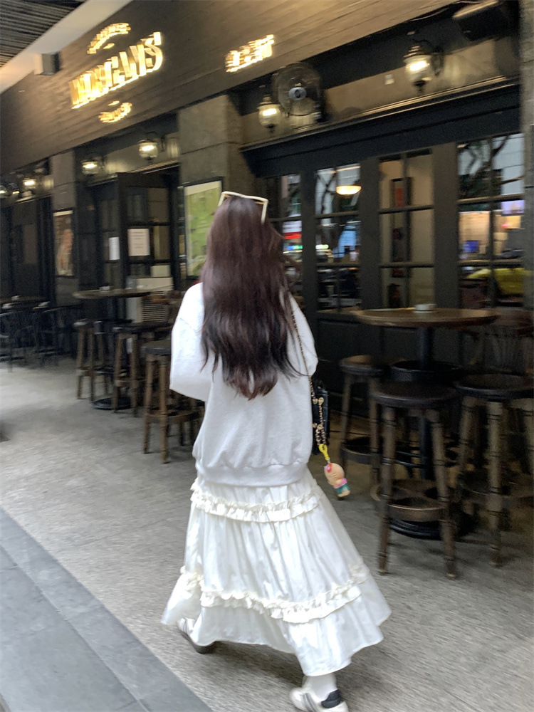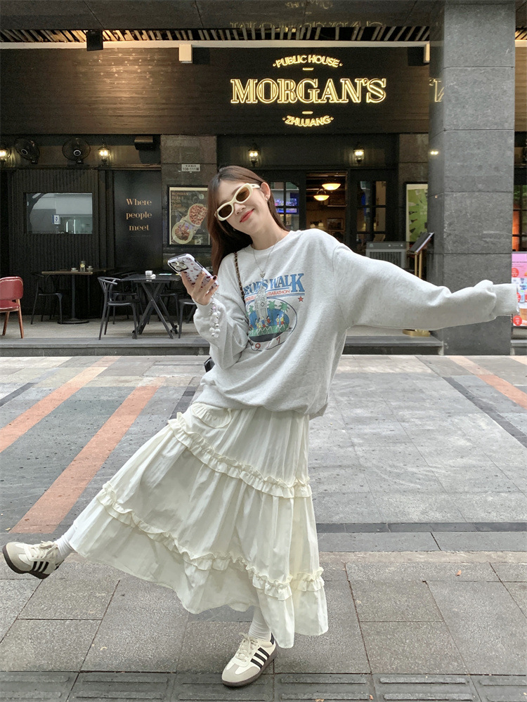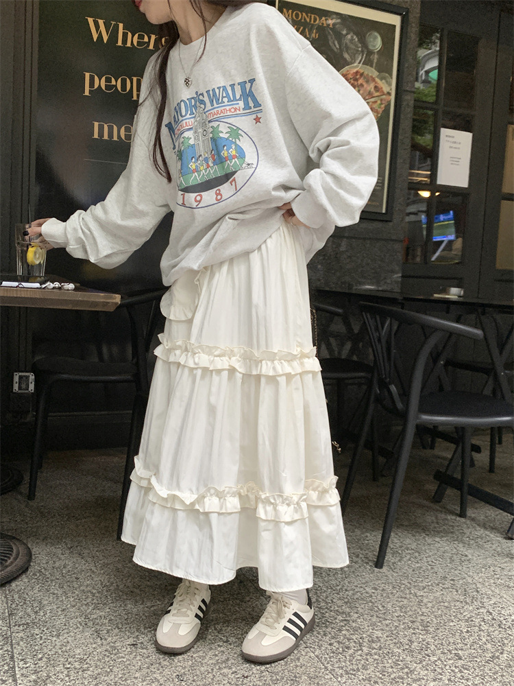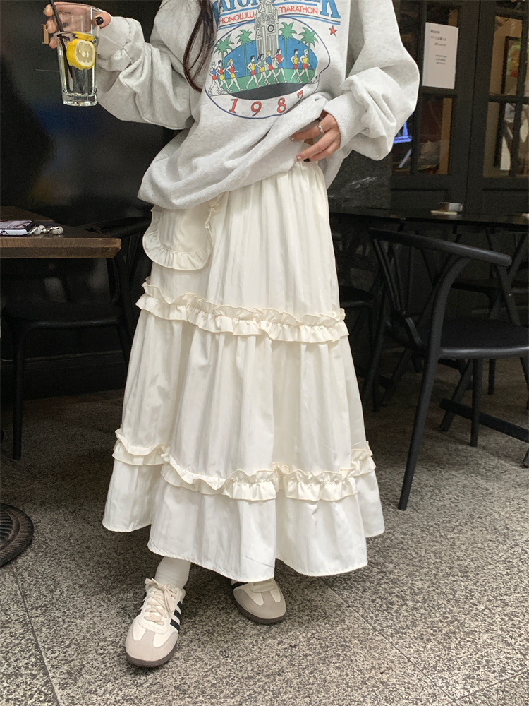 LIZAKOSHT - Wood Ear Edge French Simple Midi Skirt Sweet Women Skirts Spring Summer Elastic Waist A-line Fashion Layer Cake Skirt Tutu Korea