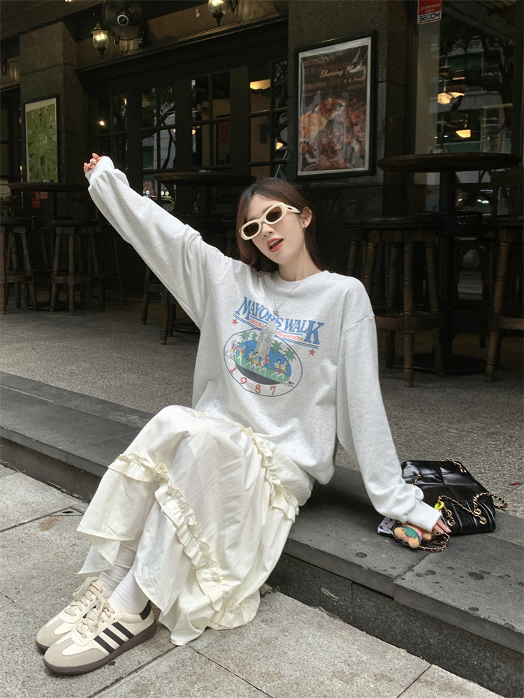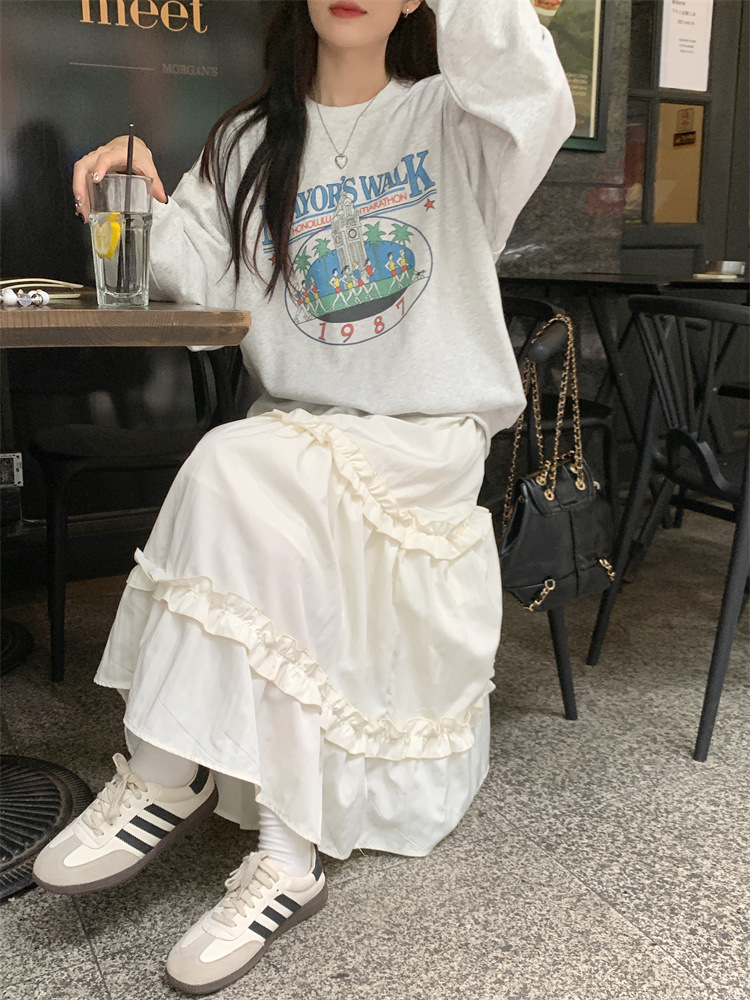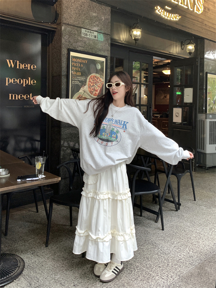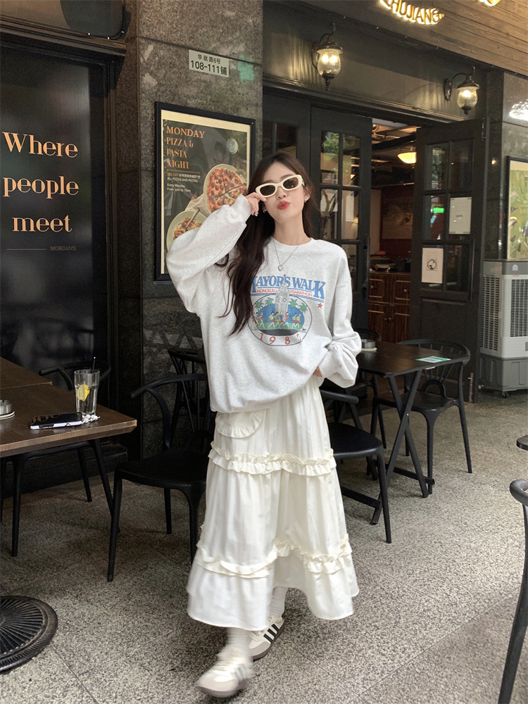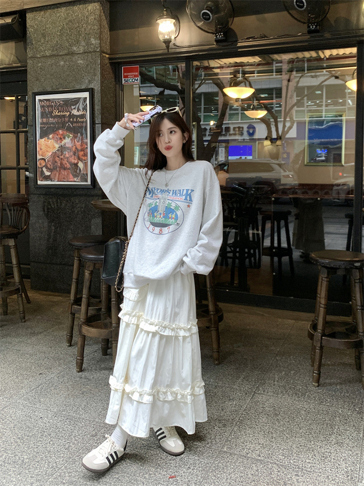 LIZAKOSHT - Wood Ear Edge French Simple Midi Skirt Sweet Women Skirts Spring Summer Elastic Waist A-line Fashion Layer Cake Skirt Tutu Korea