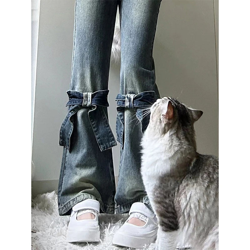 LIZAKOSHT - Y2K 2000S Flare Jeans Women Vintage High Waist Bow Denim Pants Summer Japanese Harajuku Baggy Design Wide Leg Trousers New