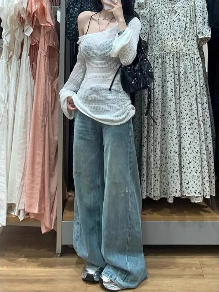LIZAKOSHT - Y2k Aesthetic Casual Hollow Out T-shirt Women Summer Vintage Harajuku Flare Sleeve Tees Summer See Through Slim Fit Grunge Tops