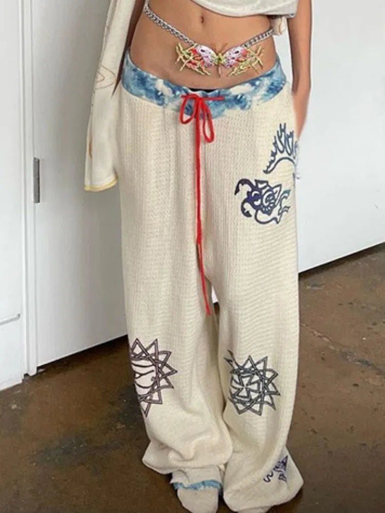 LIZAKOSHT - Y2k Aesthetic Streetwear Print Straight Pant Women Casual Patchwork Pantalon Personality Drawstring Grunge Wide Leg Trousers