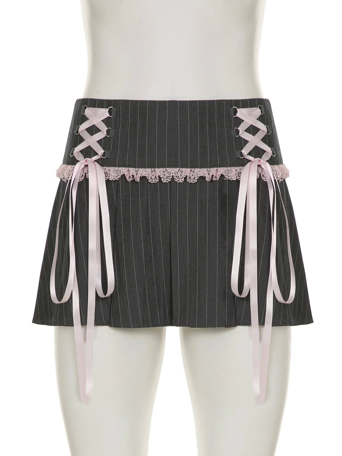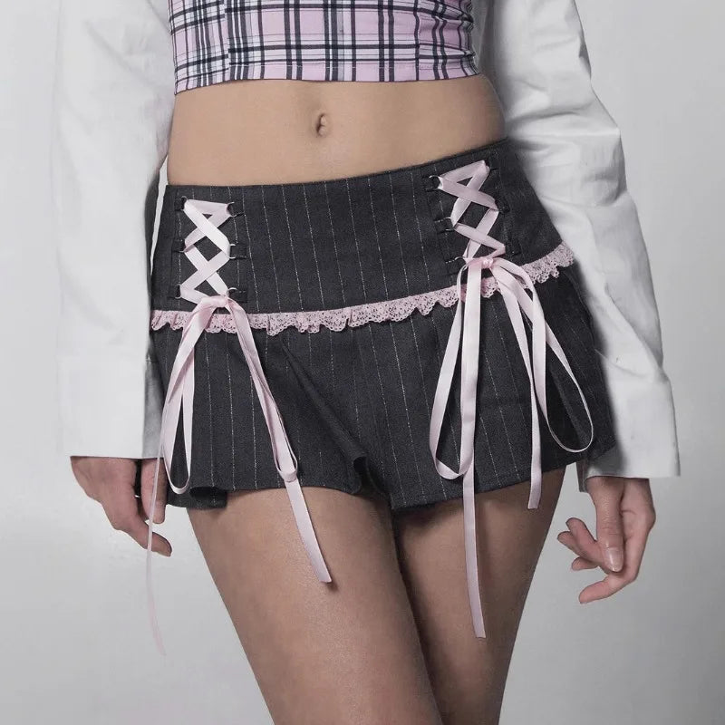 LIZAKOSHT  -  Y2k Girl Lace Bow Low Waist Pleated Striped Skirt Pastel Goth Sweet Pleated Skirt Women Aesthetic Fairy Grunge Elegant Skirt
