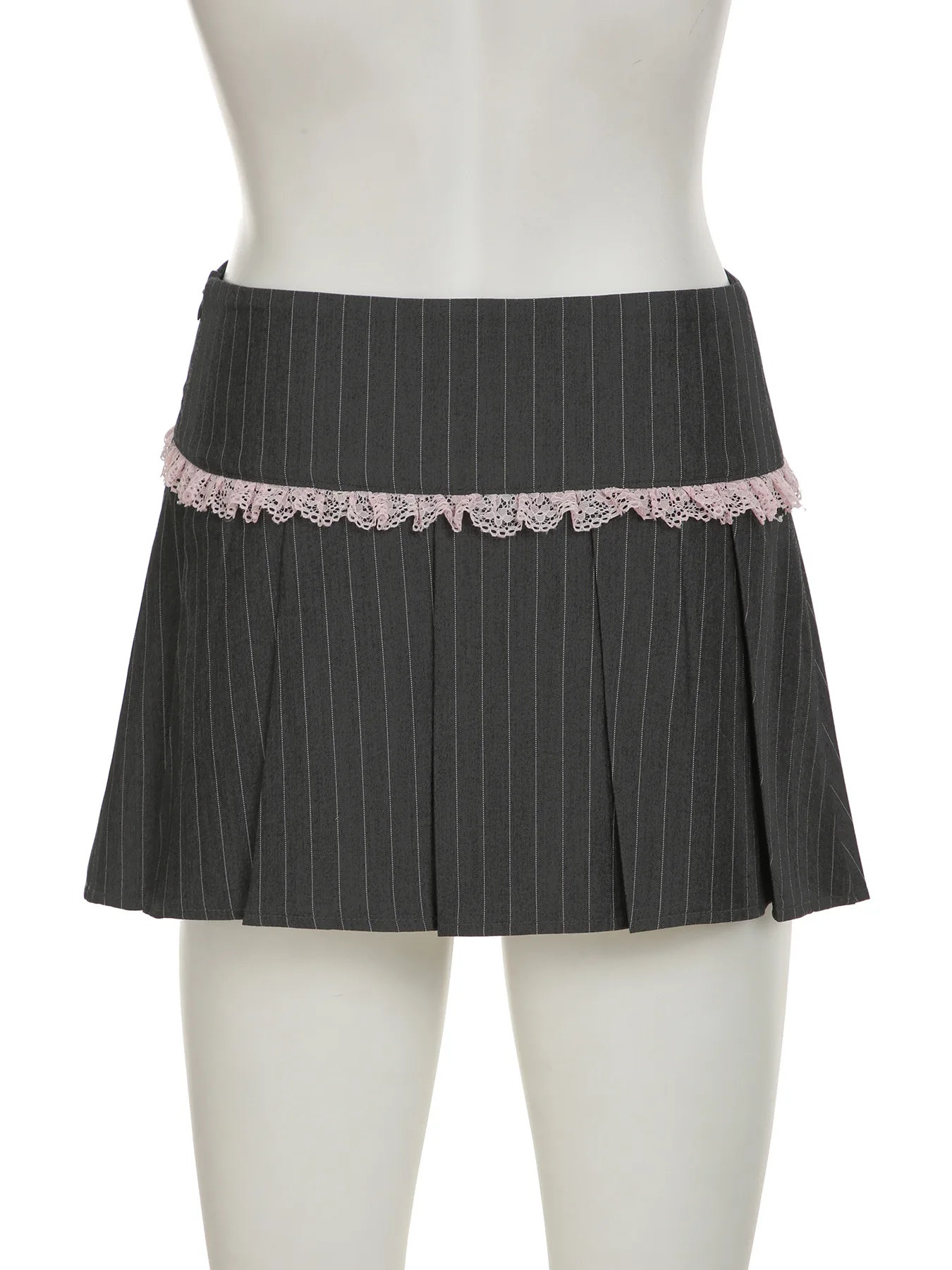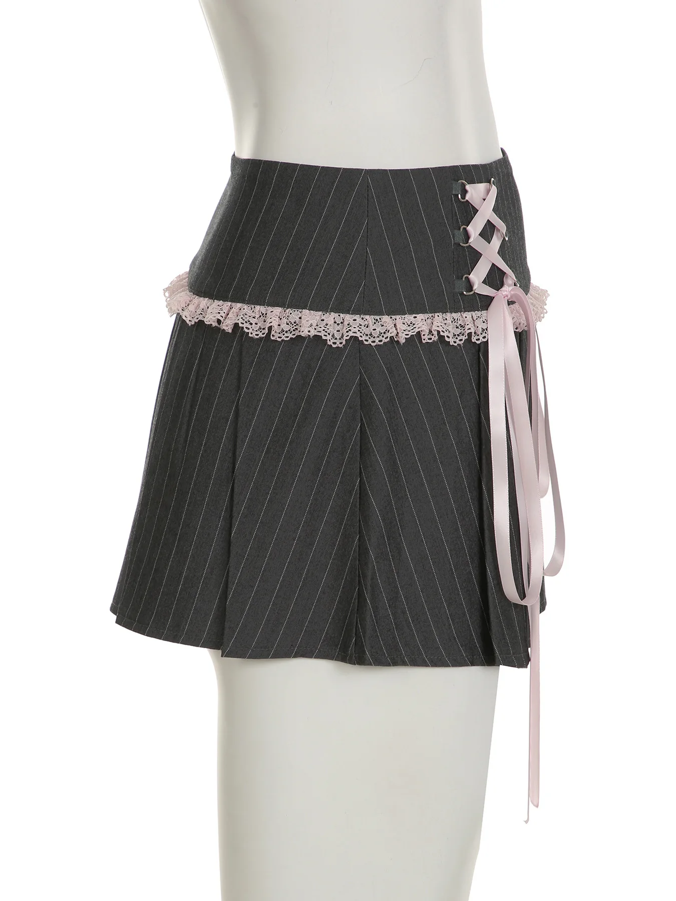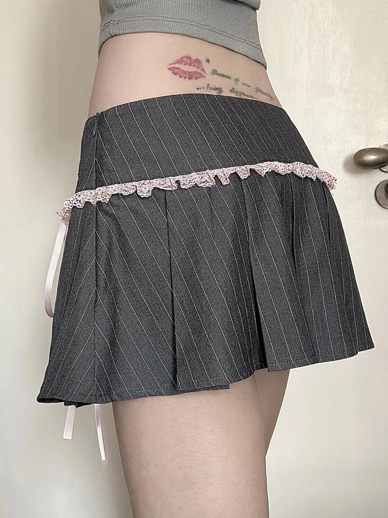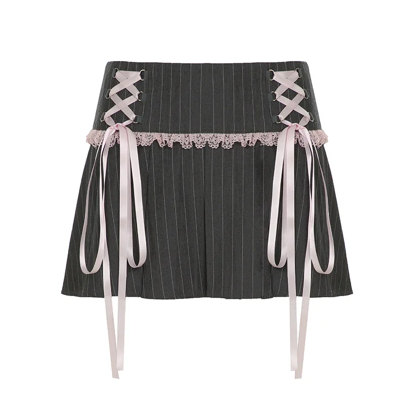 LIZAKOSHT - Y2k Girl Lace Bow Low Waist Pleated Striped Skirt Pastel Goth Sweet Pleated Skirt Women Aesthetic Fairy Grunge Elegant Skirt