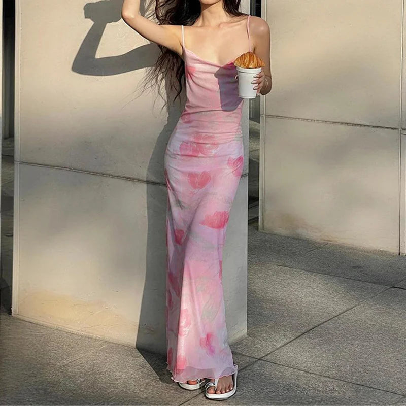 LIZAKOSHT - y2k Long Dress Women Summer Floral Print Spaghetti Strap Sleeveless Mesh Bodycon Dress 2000s Party Dresses Clubwear