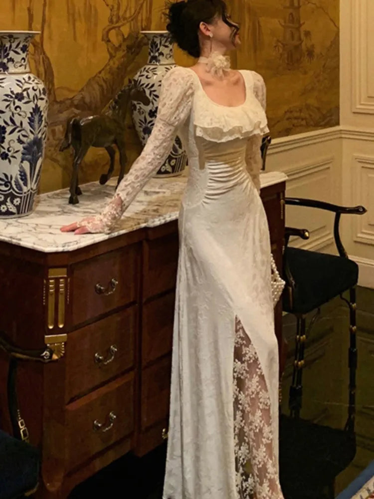 LIZAKOSHT Y2K Midi Dress Women Lace Ruffles Square Collar High Waist Slit Autumn Spring Vintage Evening Party Wedding Vestidos Prom Robe