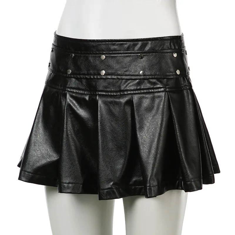 LIZAKOSHT - Y2K Rivet PU Leather Mini Skirt Hot Girl Pleated Skirt Punk Zipper Low Waist Black Party Club Skirt Female Autumn Fashion