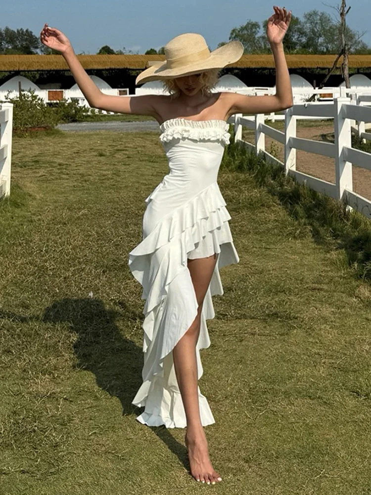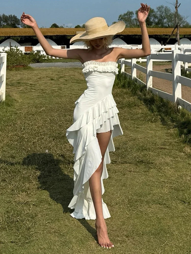 LIZAKOSHT - Y2K Tierred Maxi Dress Women Chic Summer Trend Irregular Split Hem Wrap Elegant Beach Club Party Vacation Vestidos
