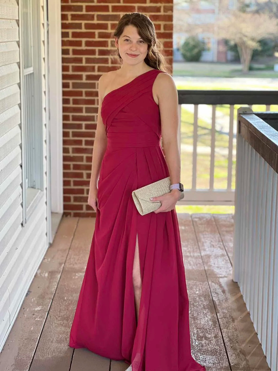 Dress to impress with this stunning One Shoulder Floor-Length Chiffon Bridesmaid Dress! The delicate ruffle backless design adds a touch of elegance to any wedding party, while the flowing chiffon fabric ensures a comfortable and flattering fit. Make a statement and turn heads at prom or evening events.