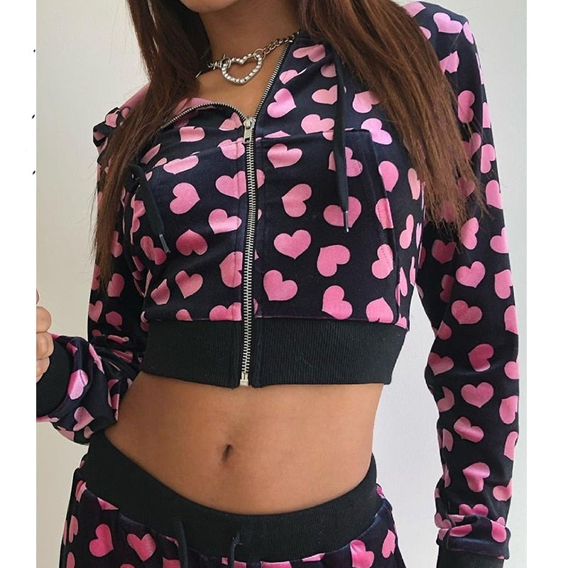Lizakosht  Velvet Harajuku Heart Sweatshirt Women Long Sleeve Jackets Korean Hoodies Thin Crop Top Outfits Vintage Kawaii