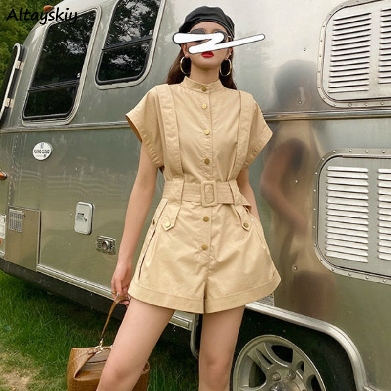 Rompers Women Short Sleeve with Sashes Solid Simple Office Ladies Work Wear European Style Plus Size S-3XL Slim Fashion Femme