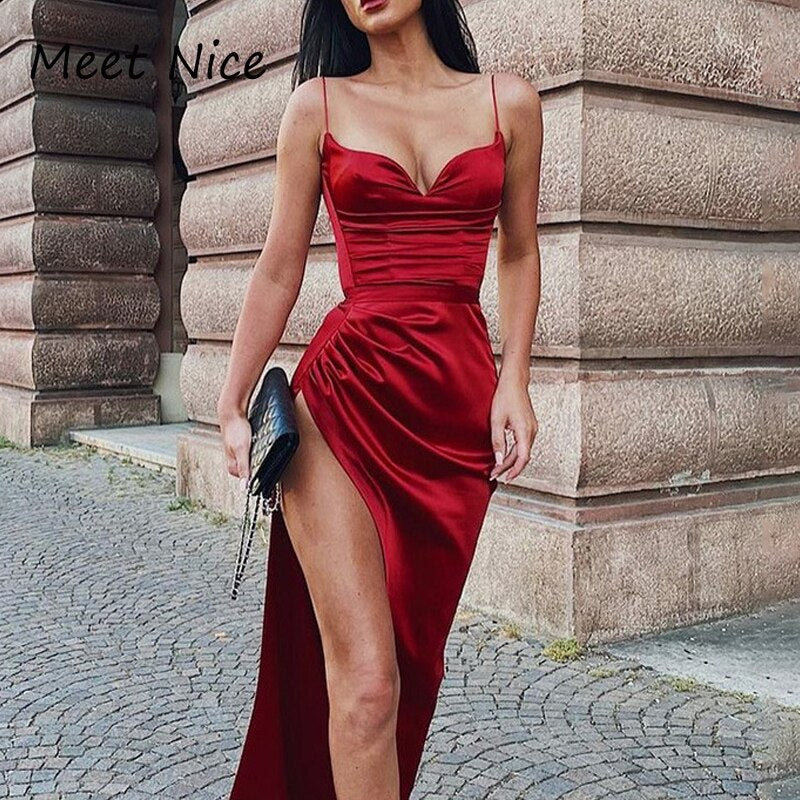 Sexy Spaghetti Strap Side Split Party Dress Women Ruched Lace up Bodycon Midi Dresses Burgundy Black Night Club Dress