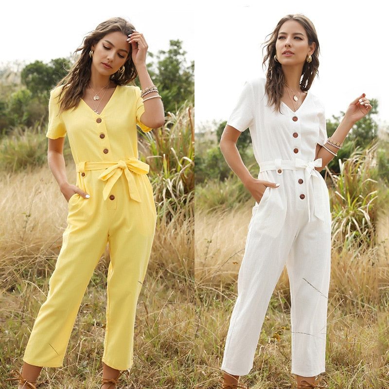 Summer Short Sleeve White Jumpsuit Women High Waist Lace Up Jumpsuit Romper Women Casual Overall Femme Wide Leg Pants
