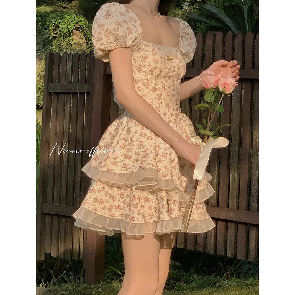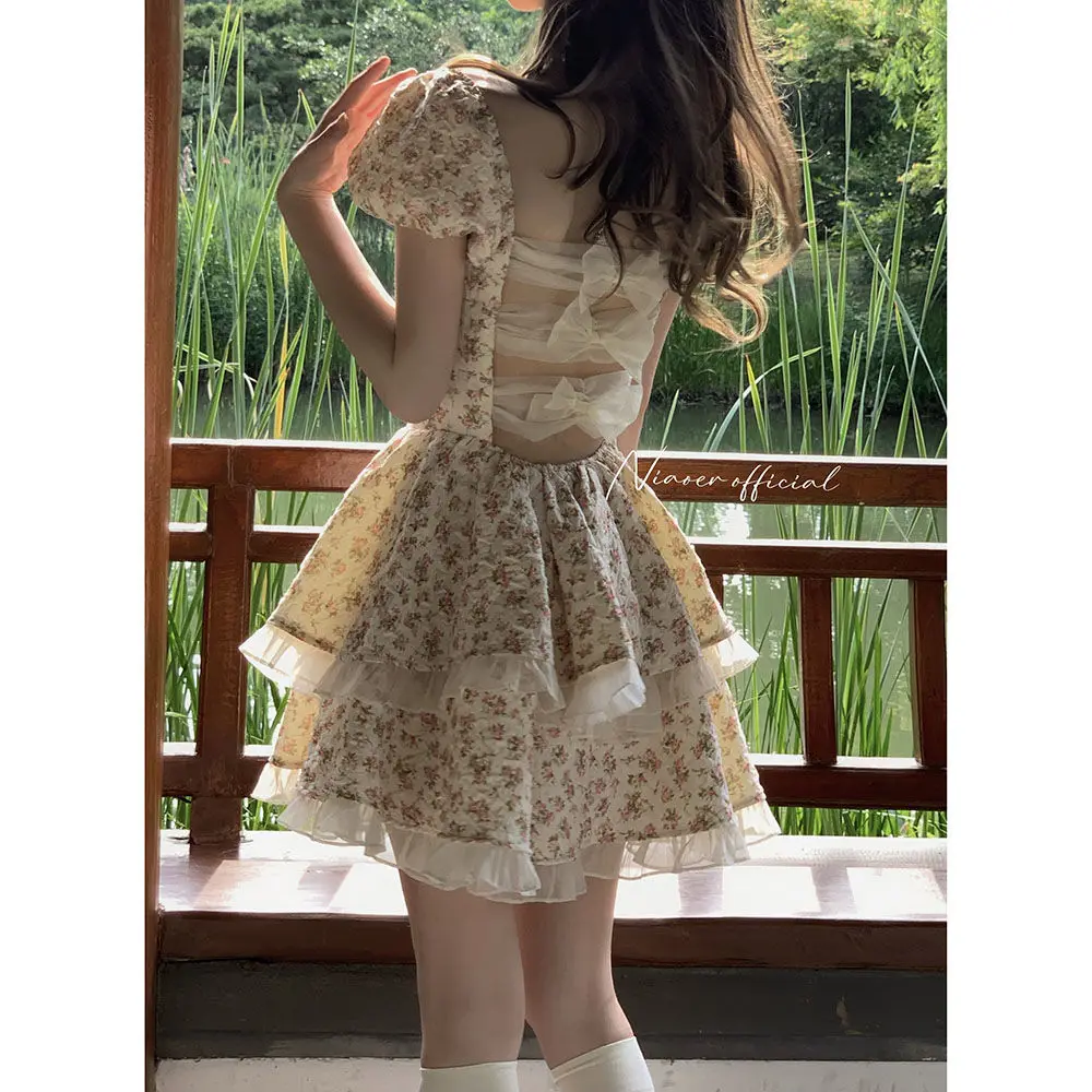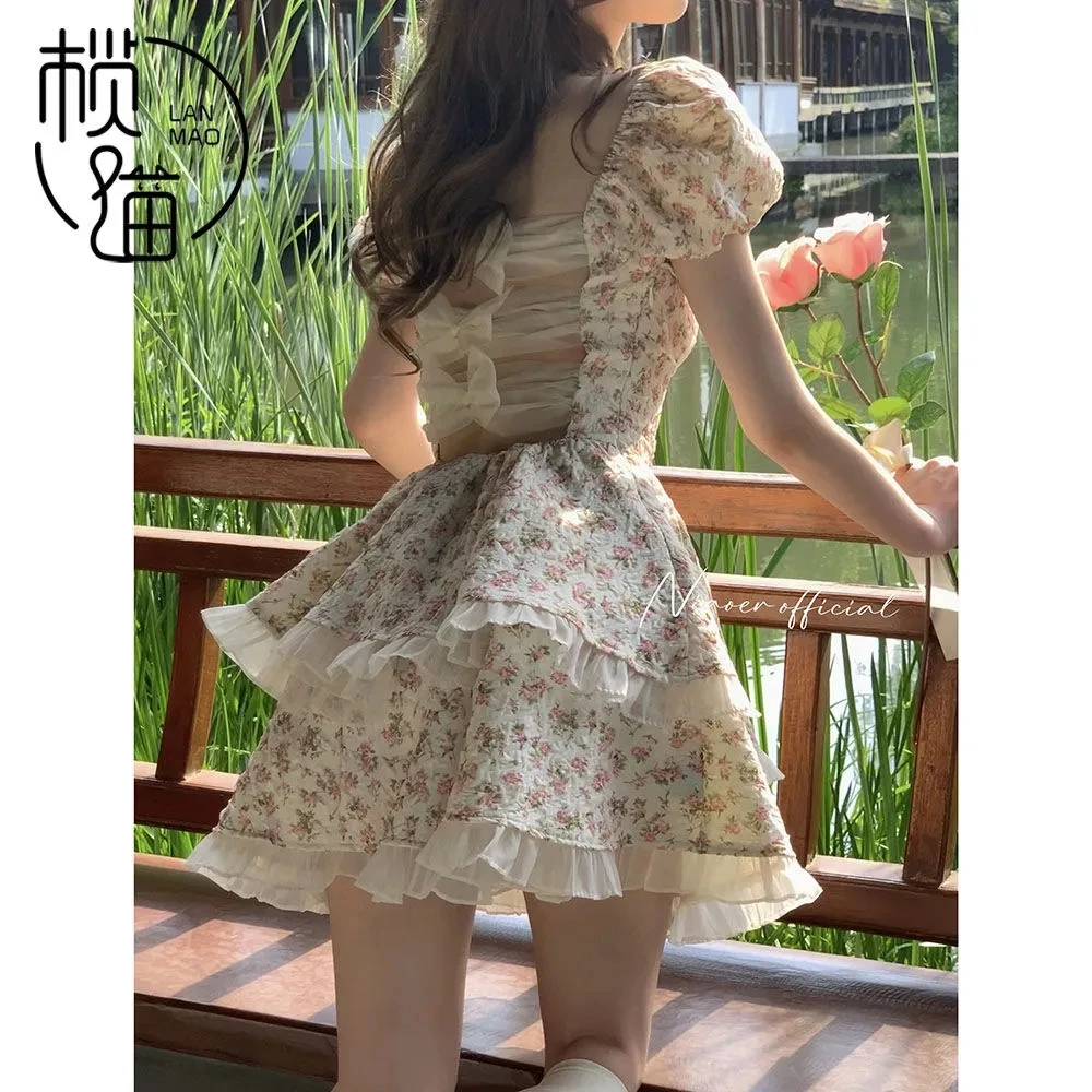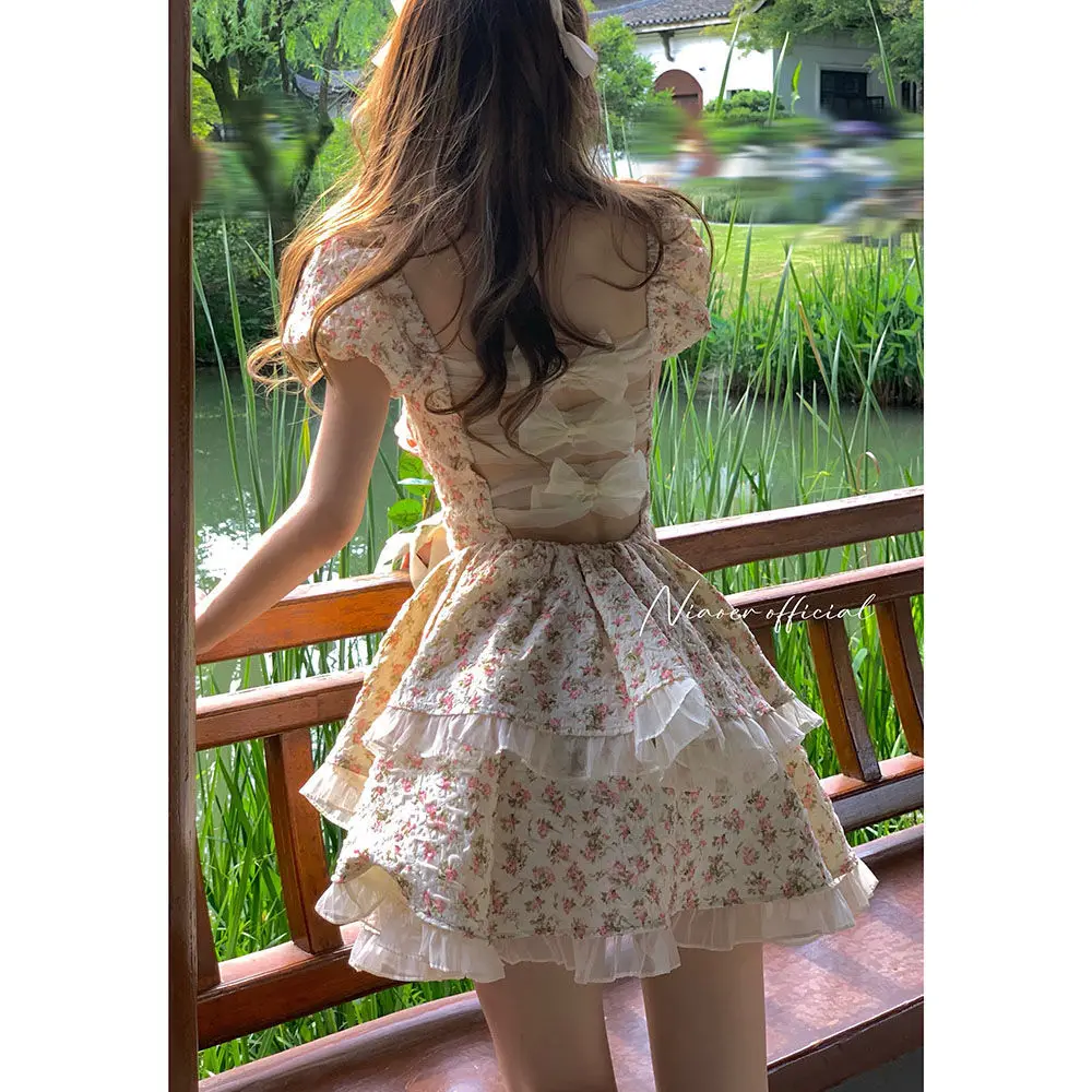 Lizakosht Summer Chiffon Floral Lace Princess Sets Women Halter Collar Sweet Two Piece Set Female Casual Kawaii Party Mini Skirt Sets
