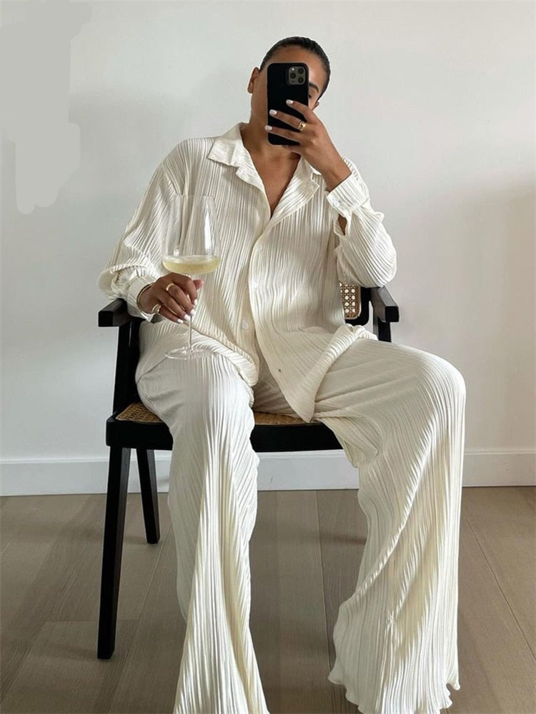 Lizakosht New Luxury Pleated Women's Set Oversized Two Piece Set Turn Down Collar Shirt Top And Pants Sets Casual High Street