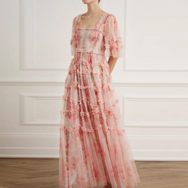 Lizakosht Vacation Floral Print Long Dress Women Short Sleeve Boho Fairy 3 Layers Mesh Pink Fit Flare Party Vestidos Runway Clothes F281