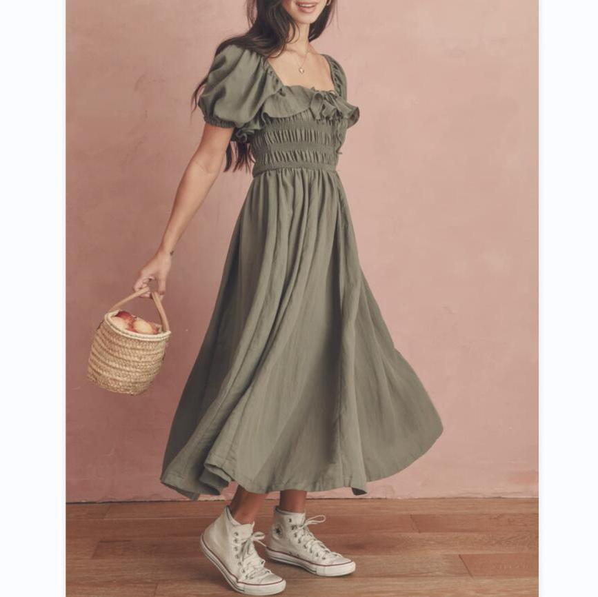 Lizakosht  Vintage clothes dress elegant midi dresses short sleeve square neck dress puff sleeve shirred dresses for women Summer
