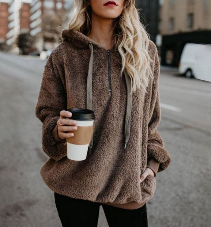 Women Fleece Hoodies  Long Sleeve Hooded Pullover Sweatshirt Autumn Winter Warm Zipper Pocket Fur Coat Plus Size 5XL